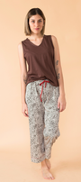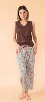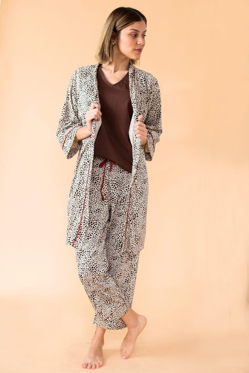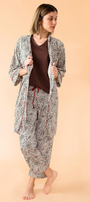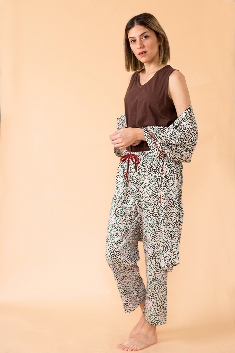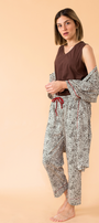 Your Antonia set is both classic and modern—a versatile ensemble designed to accompany you during your leisure time with comfort and style. It includes three pieces that complement each other perfectly: a top, capri pants, and kimono. You can wear them together or separately, depending on your mood of the day.