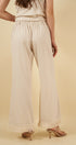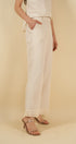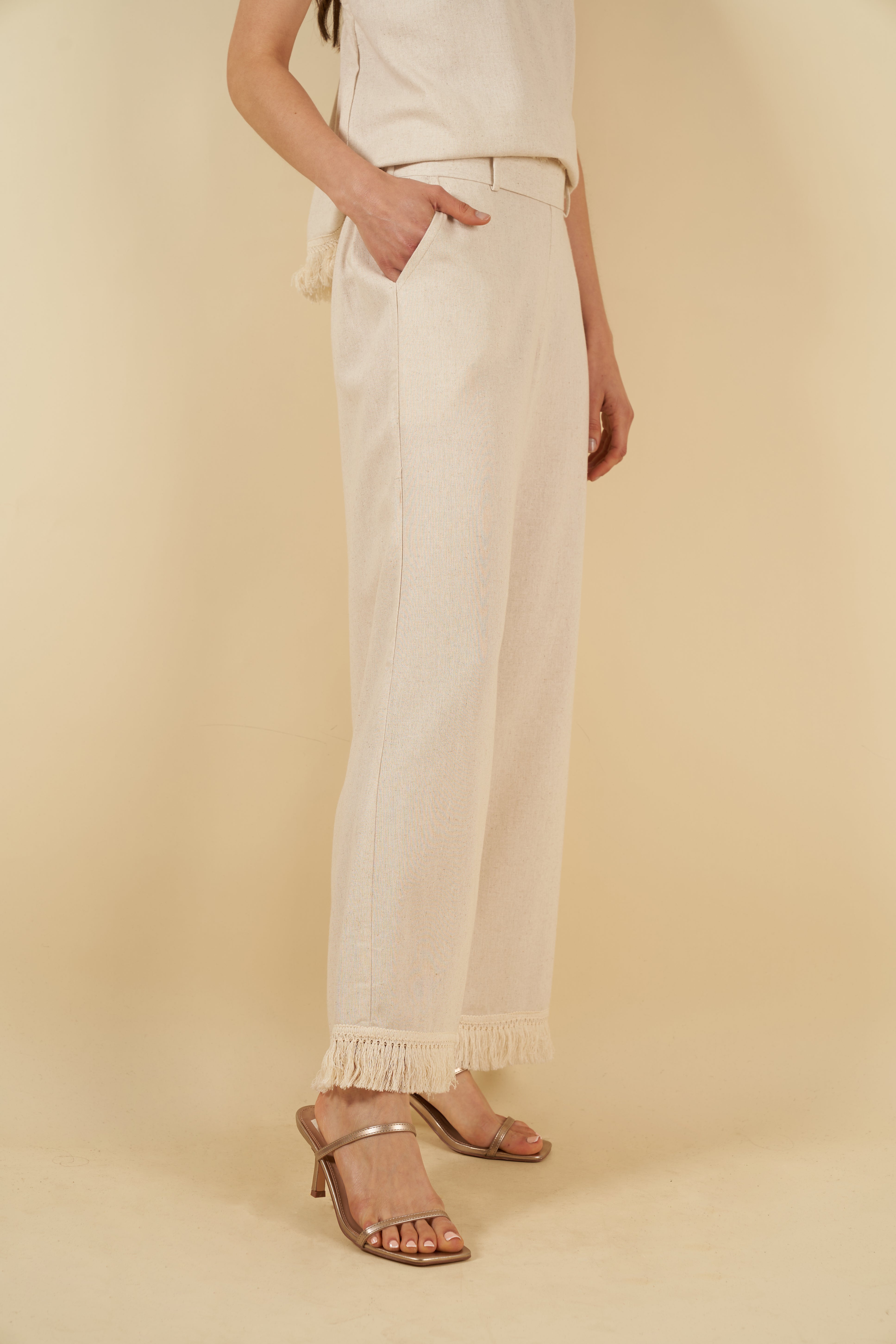 El pantalón Muriel equilibra confort y estilo mediante detalles pensados para el día a día: bolsillos laterales funcionales y un elástico posterior que asegura un ajuste cómodo y flexible. Los flecos en el bajo completan el diseño con un toque distintivo y perfectamente integrado al conjunto.