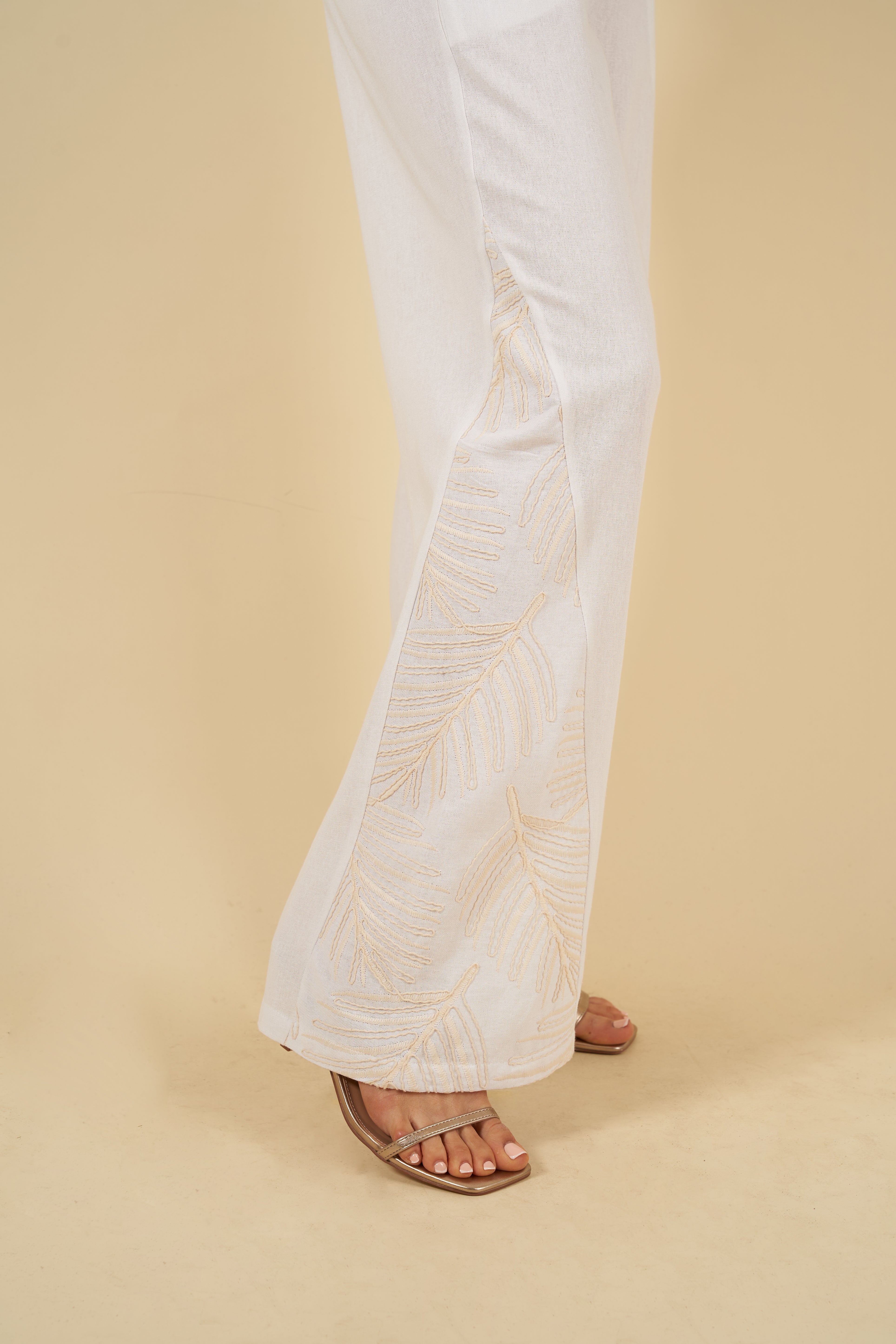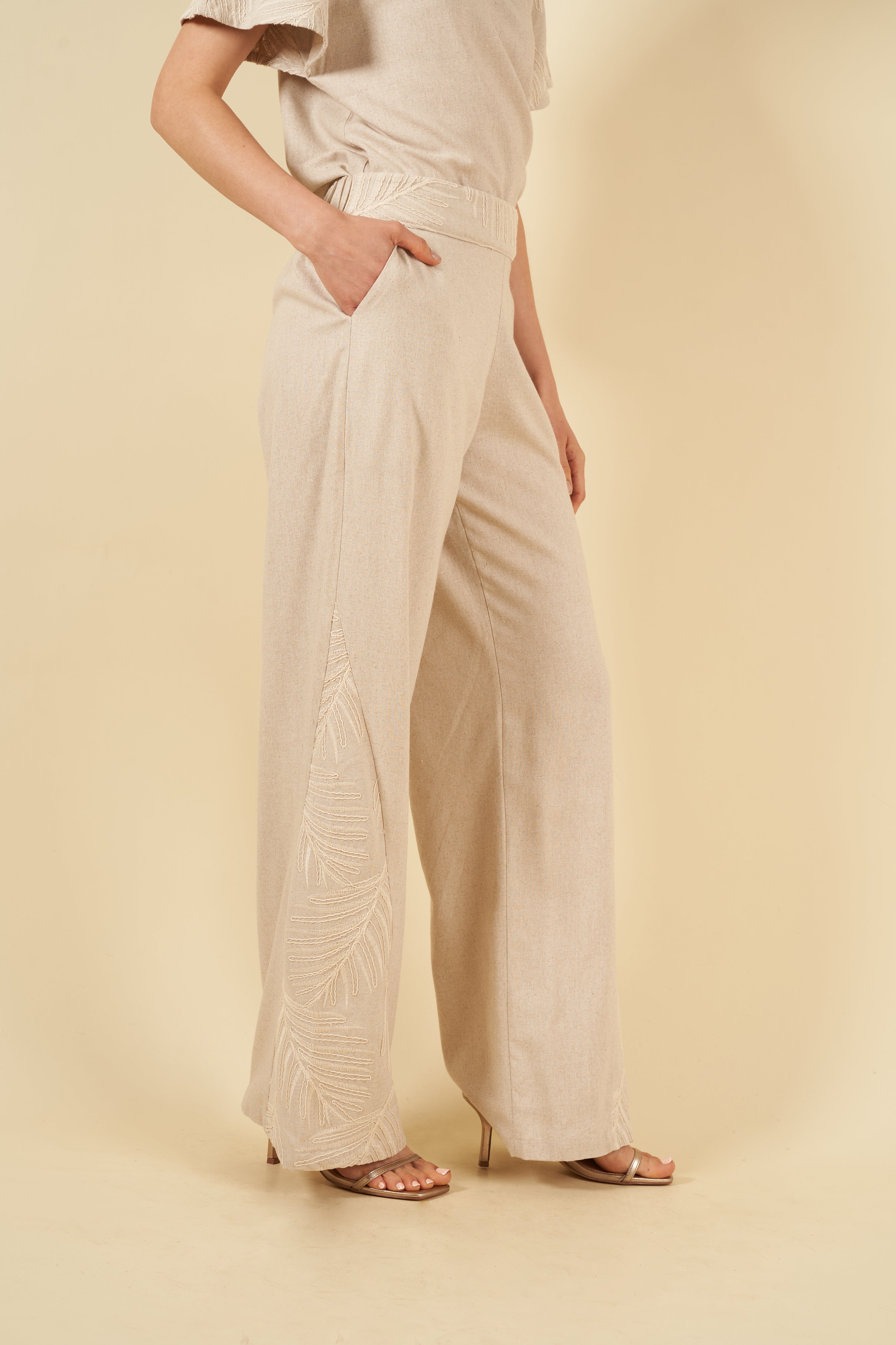 El pantalón Sabine de pierna recta es pura comodidad: cuenta con bolsillos laterales y elástico en la espalda para un ajuste flexible y favorecedor. Los bordados en los laterales añaden un detalle distintivo que lo hace único.