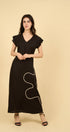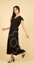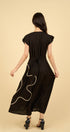 Sutil, femenino y sofisticado. La flor de cinta blanca aplicada en la pierna transforma este vestido negro en un diseño único.