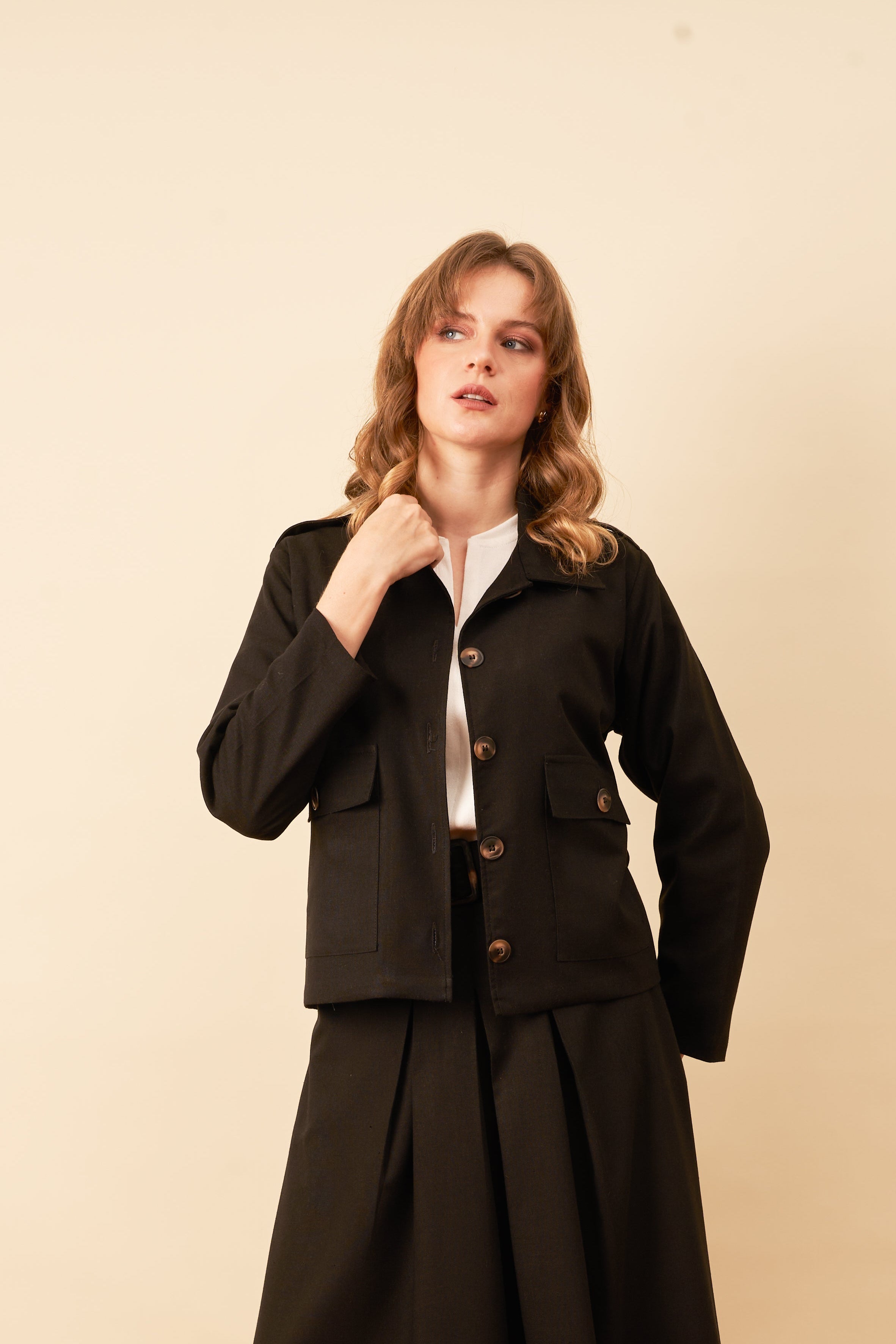 La casaca Eloise en lino con viscosa es ligera y cómoda, perfecta para esas noches frescas de verano. Tiene bolsillos prácticos y botones de resina que le dan un toque elegante y moderno.”