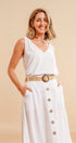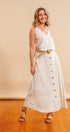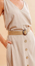 Tu set Luhana es súper versátil, cómodo y moderno. Puedes usar sus tres piezas juntas o por separado. La falda tiene botones de concha de coco al frente, bolsillos laterales y elástico en la parte posterior de la cintura para un calce cómodo y favorecedor. La blusa es de tirantes, puedes usarla de dos formas: con cuello en V o tipo halter, ajustándola al frente o en la espalda. La correa de soguilla con filo en cuero vegano y hebilla de concha de coco le da el toque final perfecto.