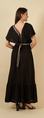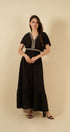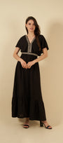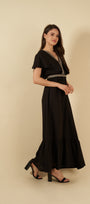El Vestido Camila en negro es una prenda exclusiva, elegante y moderna, ideal para realzar tu estilo en los días de verano. Diseñado en lino ligero, incorpora detalles de soga en la pechera y en la cintura, que aportan un toque artesanal contemporáneo. Además, cuenta con un bobo delicado en la pechera y en la falda, que añade movimiento y un aire coqueto sin perder sofisticación.