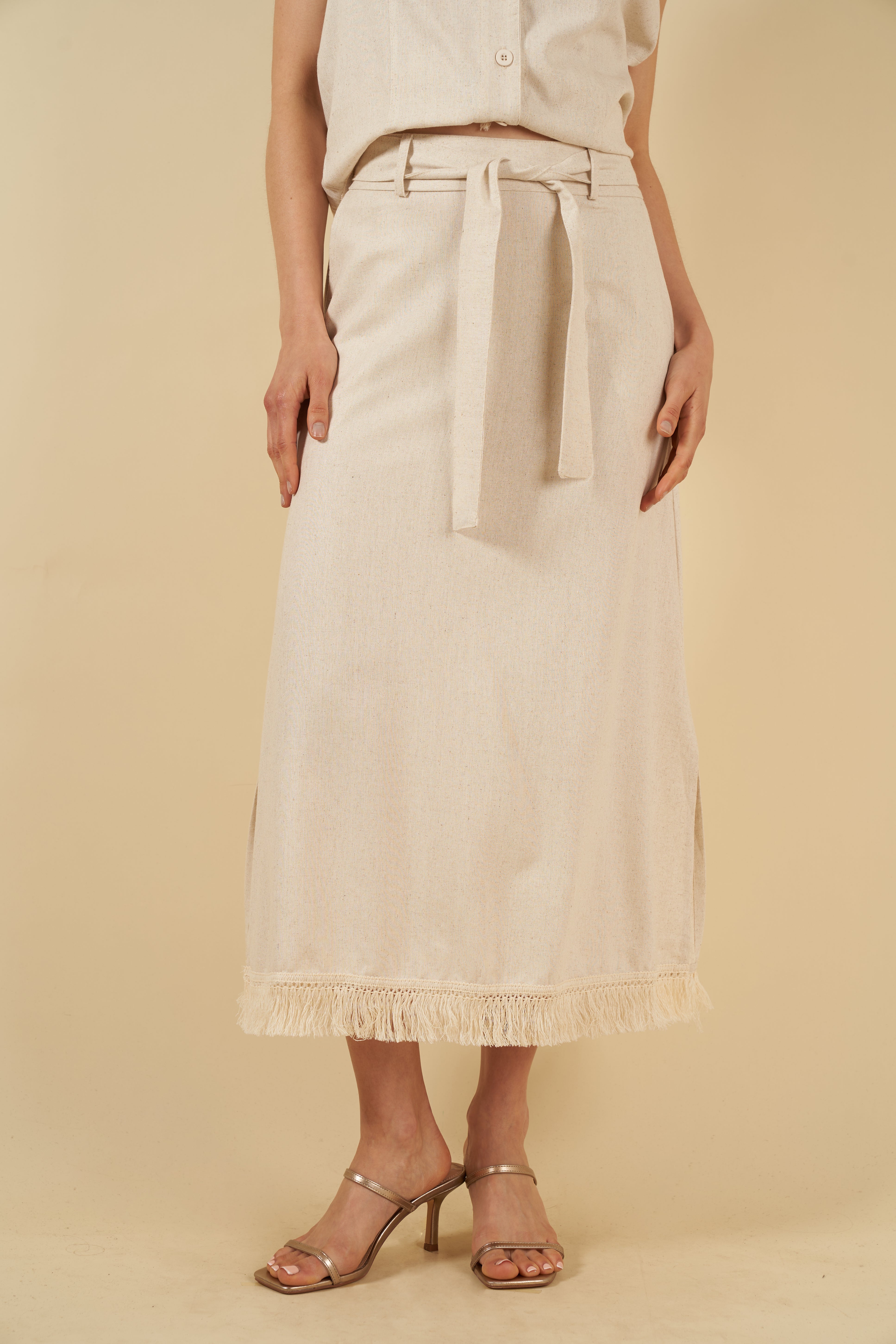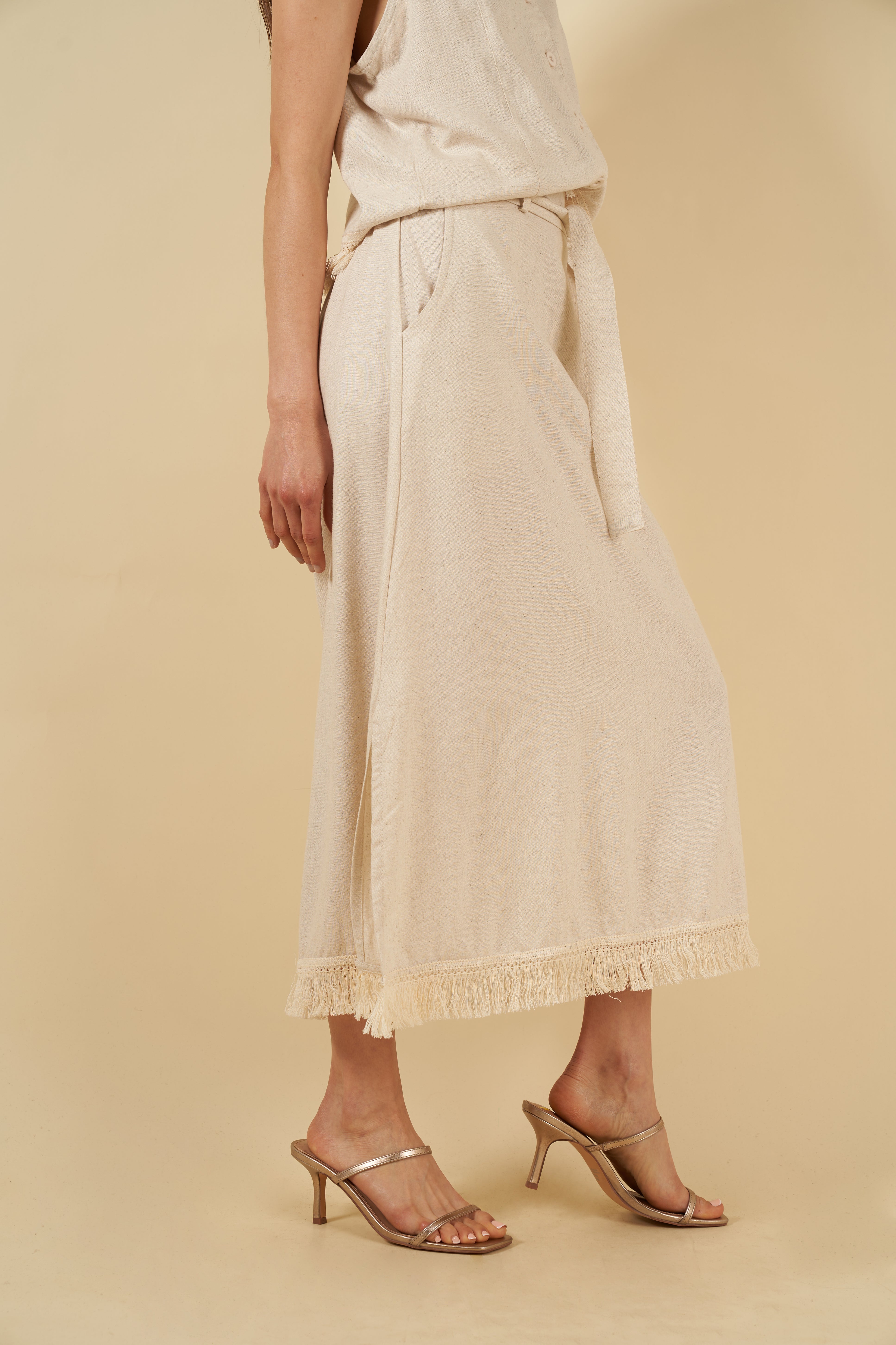 Tu falda Thalía es ligera, femenina y práctica, diseñada para acompañarte con estilo bajo el sol. Su silueta fluida y su suavidad al movimiento la vuelven una pieza comodísima, mientras que los flecos en el ruedo aportan un acabado delicado y artesanal.