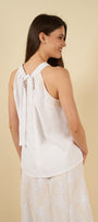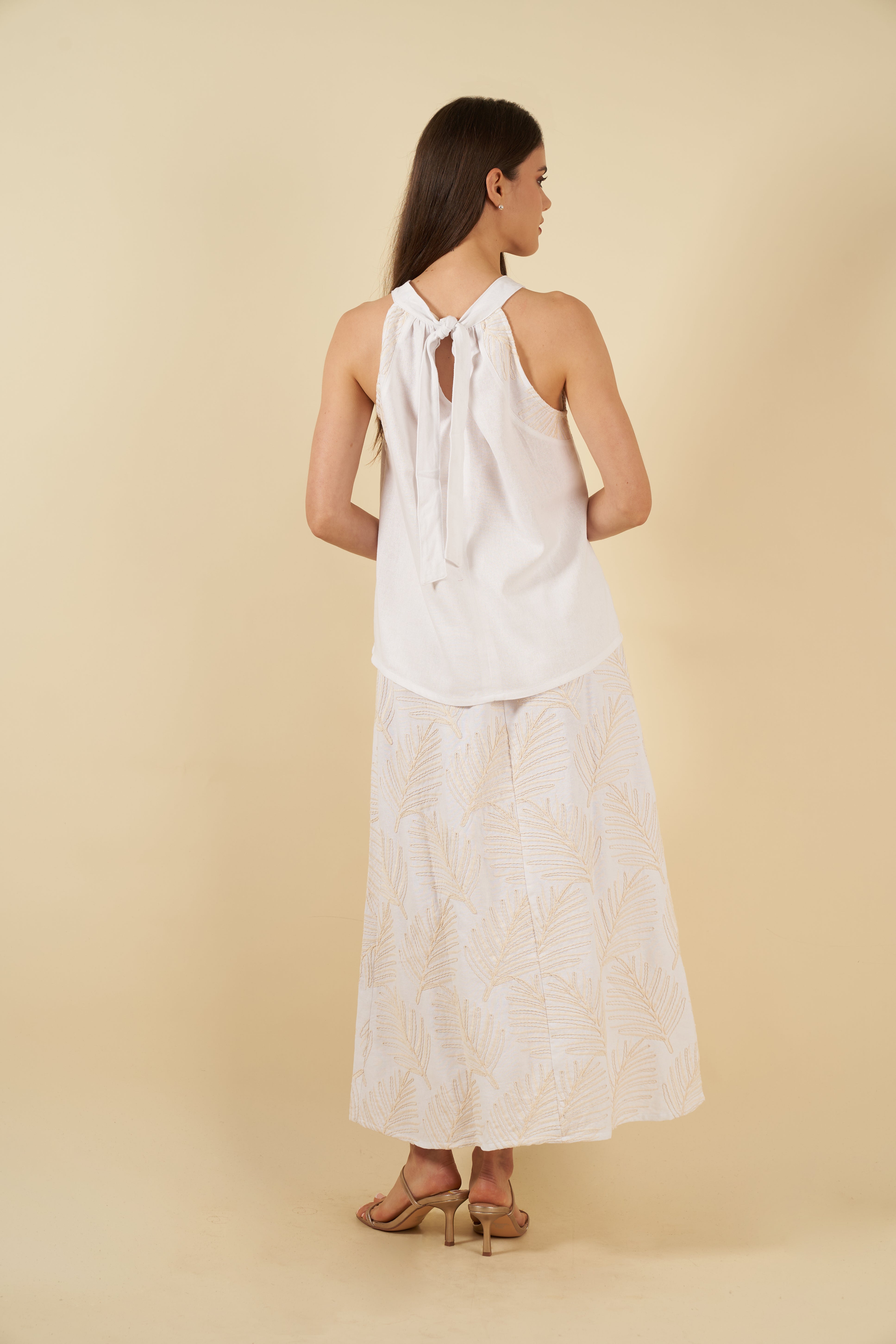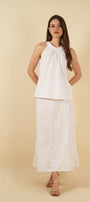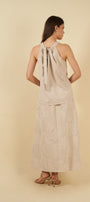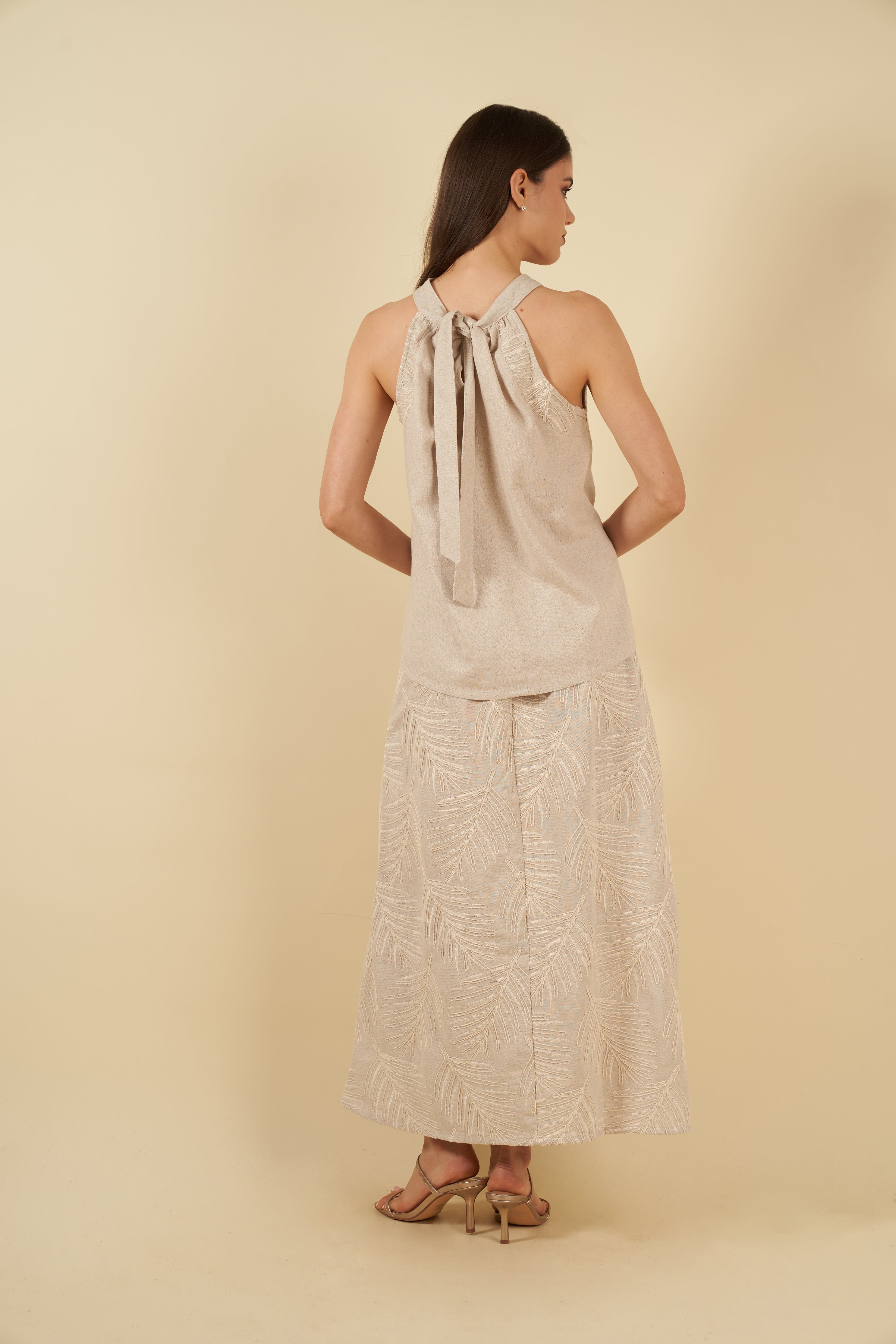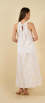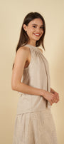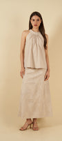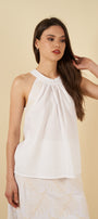 El top, de corte halter y amarre en la nuca, ofrece una silueta delicada y femenina. Los pliegues frontales aportan movimiento y un toque artesanal, mientras que su caída fluida envuelve el cuerpo con comodidad y frescura.