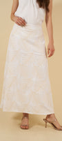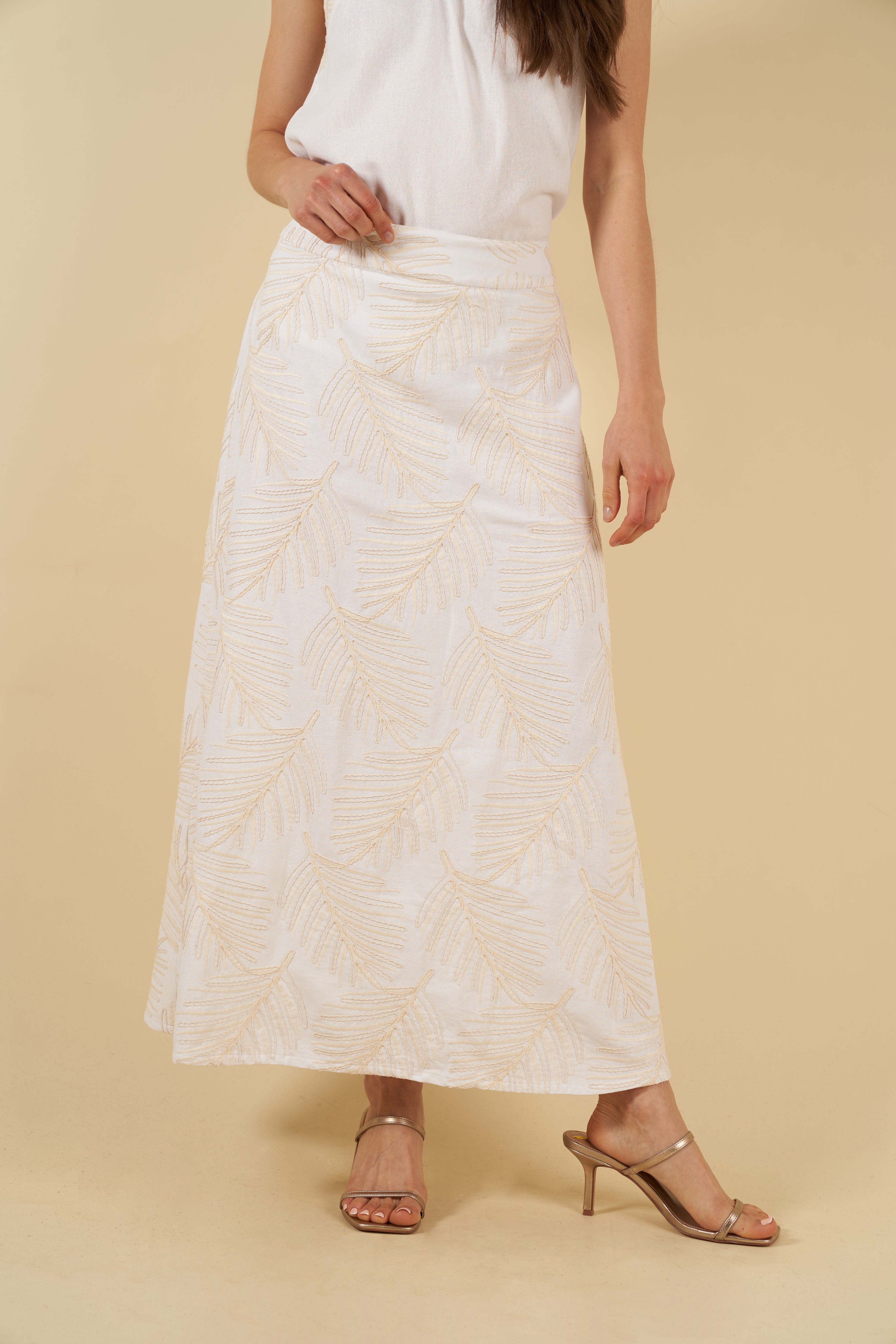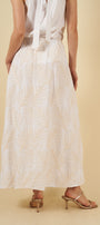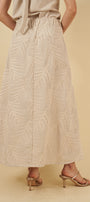 La falda, de línea larga y elegante, incorpora un hermoso tejido con bordado que añade textura, luz y carácter. Su diseño incluye bolsillos laterales funcionales y discretos, así como un elástico posterior que asegura un ajuste cómodo, adaptable y favorecedor sin perder refinamiento.