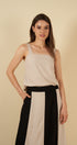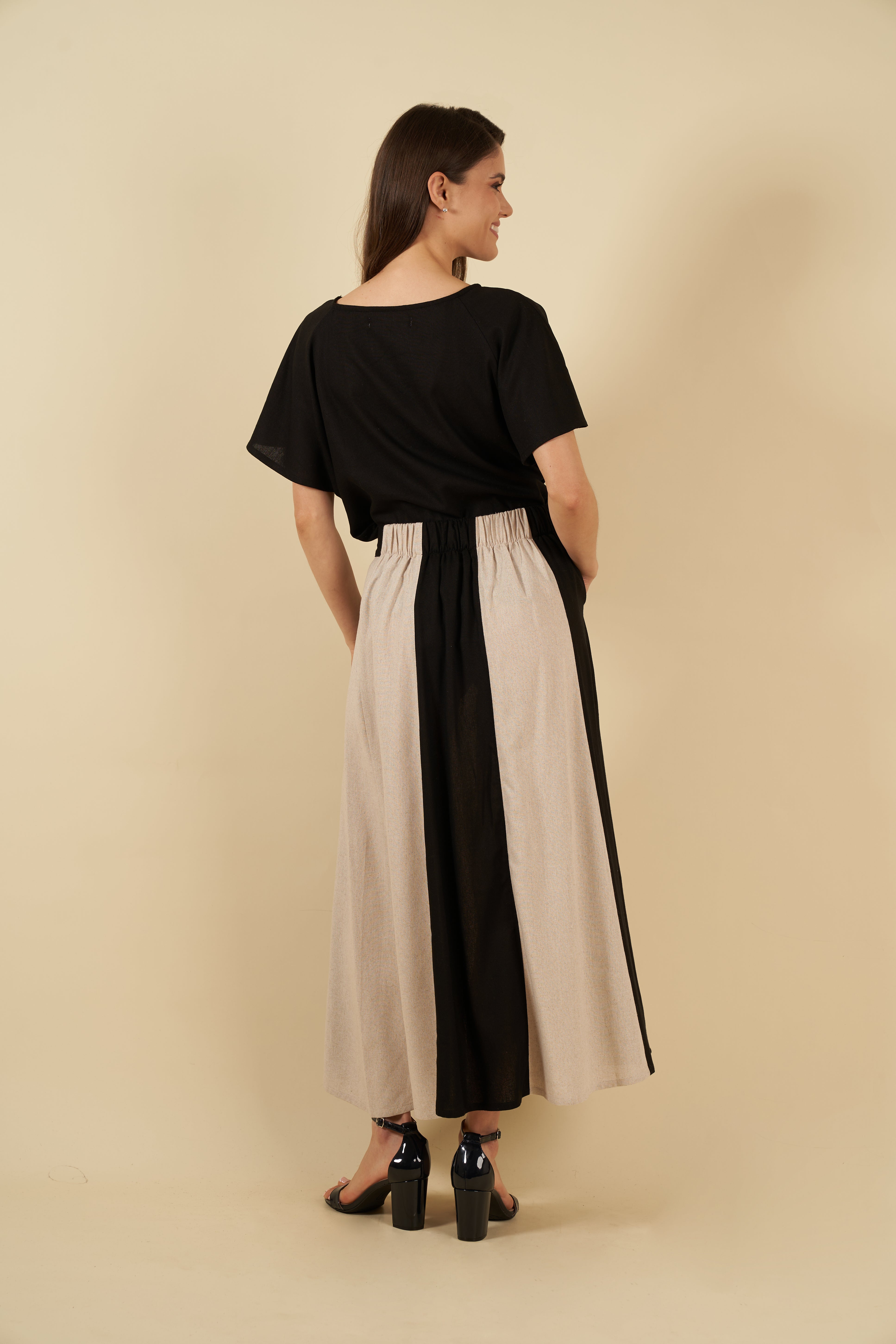 La falda Eugenia está confeccionada en lino con viscosa de textura suave y caída fluida. Su diseño bicolor aporta un detalle refinado que la hace única, mientras que su carácter ligero, fresco y versátil la convierte en una pieza atemporal, ideal para looks femeninos y contemporáneos que se elevan con naturalidad.
