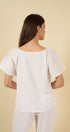 La blusa, con mangas amplias y delicados bordados, aporta un toque artesanal que eleva instantáneamente el look. Su caída suave y su diseño limpio la hacen una pieza ideal para usar tanto en conjunto como por separado.