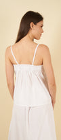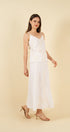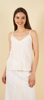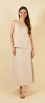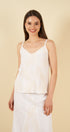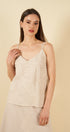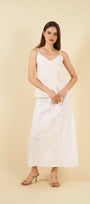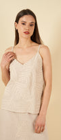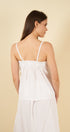 El top, con tirantes finos y escote en V, destaca por su línea limpia y femenina. Los bordados delicados aportan textura y un aire artesanal único, mientras que el elástico en la espalda asegura un ajuste cómodo, flexible y perfectamente adaptado al cuerpo.