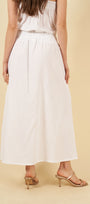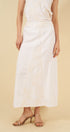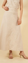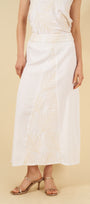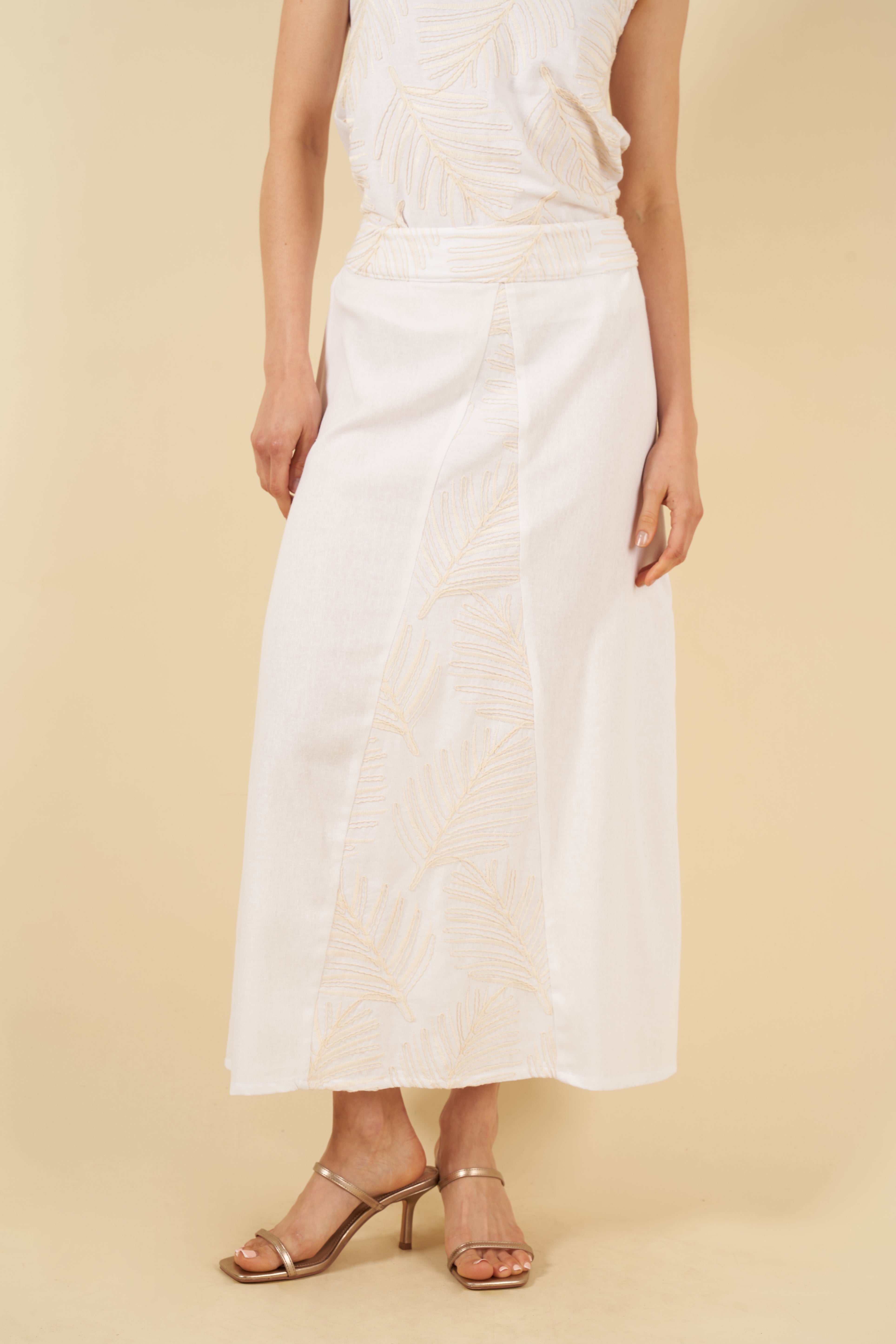 La falda, de silueta fluida y movimiento suave, combina comodidad y estilo gracias a los paneles bordados que aportan dimensión y un toque distintivo. En la parte posterior, un elástico discreto garantiza un calce agradable y adaptable sin perder elegancia.