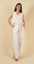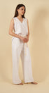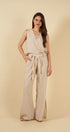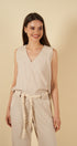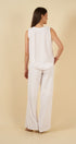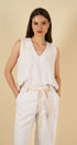 La blusa sin mangas, con escote en “V” y delicados bordados en la parte superior, aporta un toque artesanal que realza su diseño limpio y minimalista. Su caída suave y su silueta relajada la convierten en una prenda versátil, perfecta para usar tanto en conjunto como por separado.
