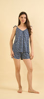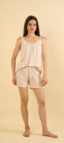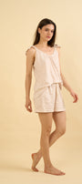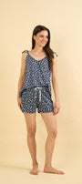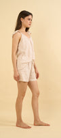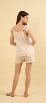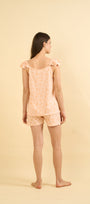 Siente la suavidad incomparable del algodón pima peruano premium en este conjunto de blusa y short, moderno y cómodo. Los delicados bordados en el filo del bobo y en la pierna aportan un toque femenino y sofisticado a cada momento de descanso.”