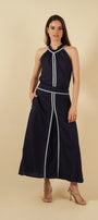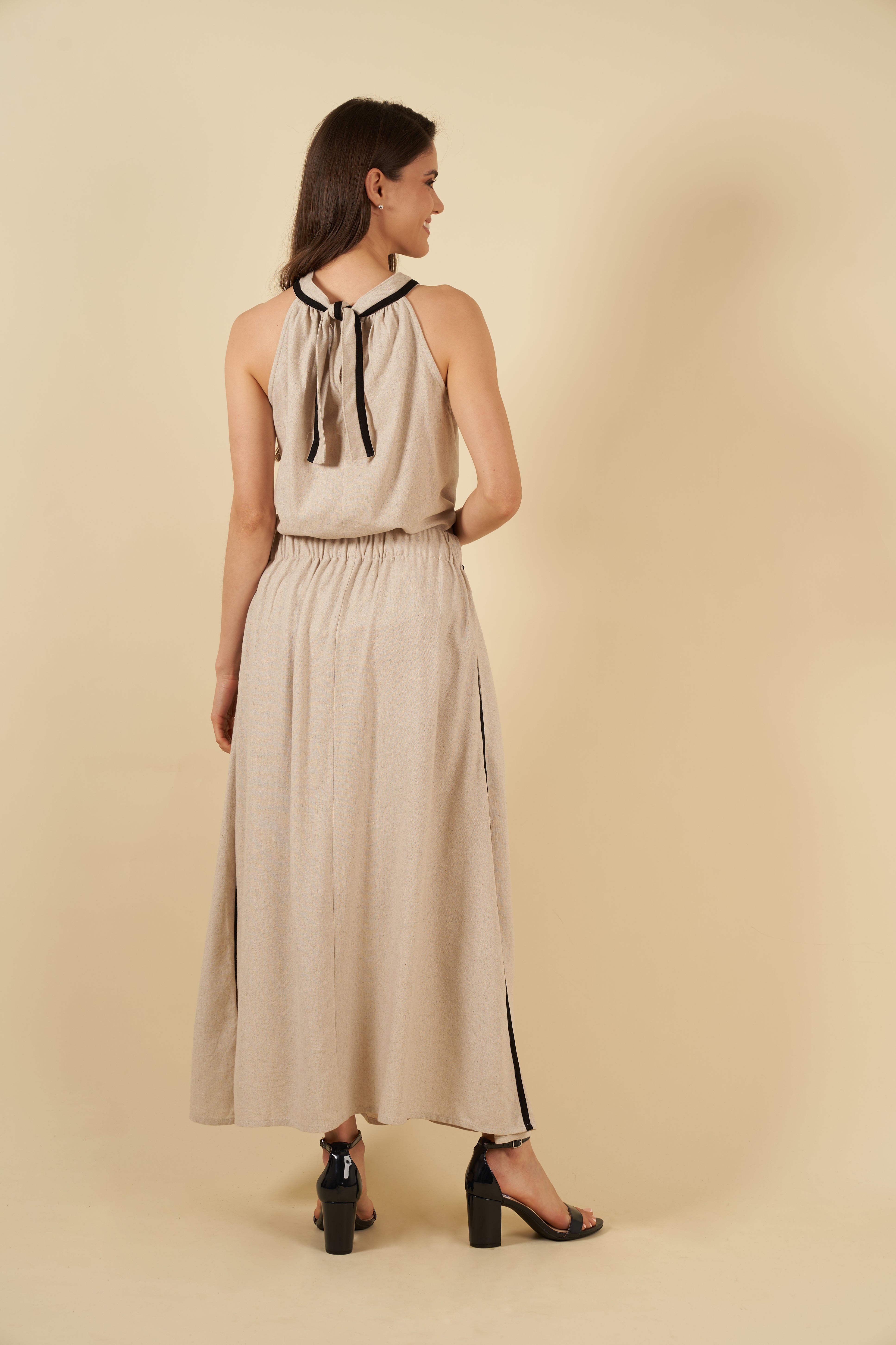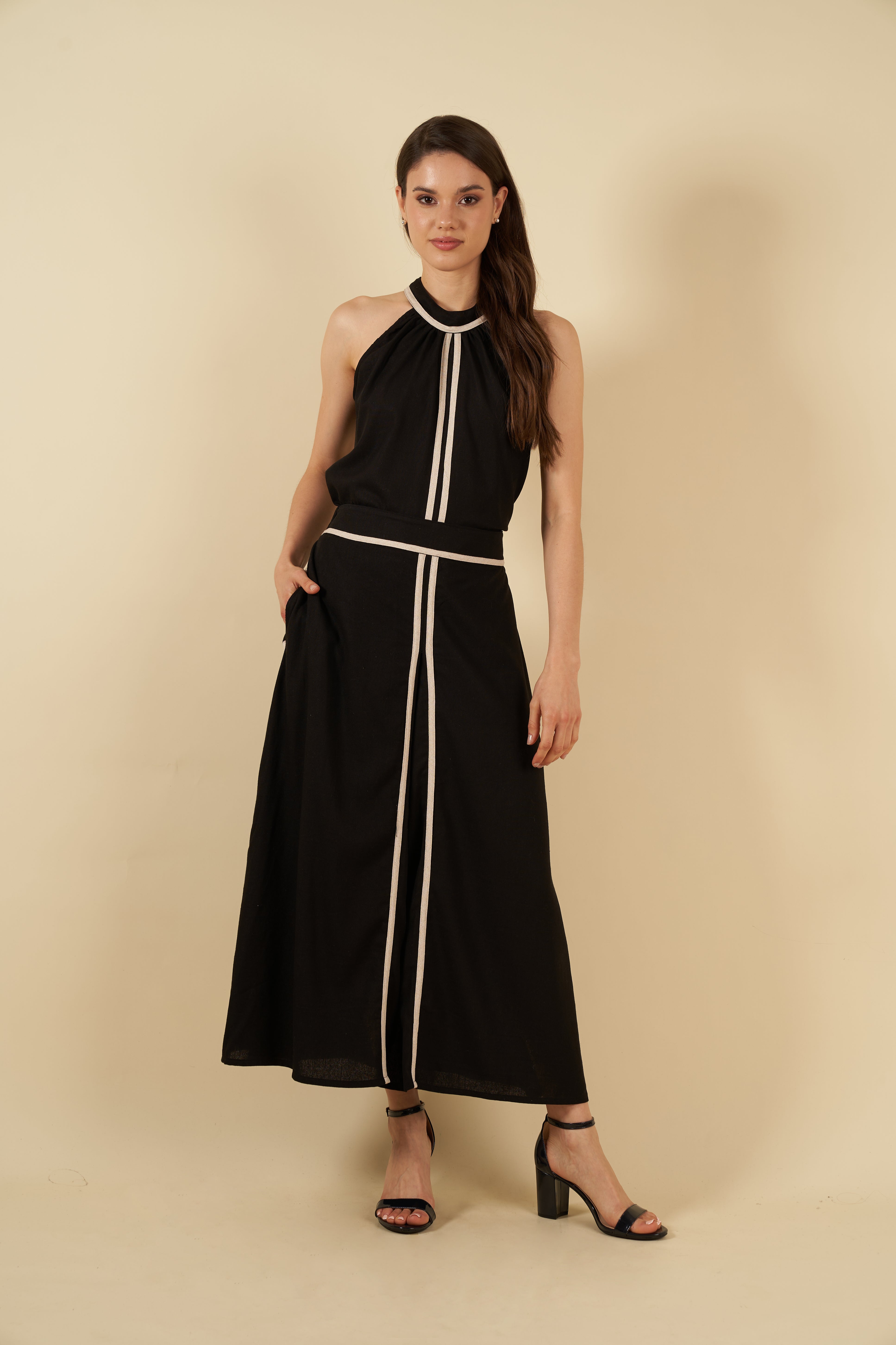 El Set Aniana incluye una falda de lino y un top halter con un elegante detalle en segundo color. Cada pieza está diseñada para complementar la silueta, creando un conjunto fresco, moderno y súper estilizador.