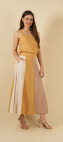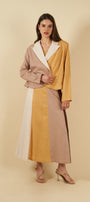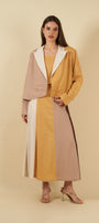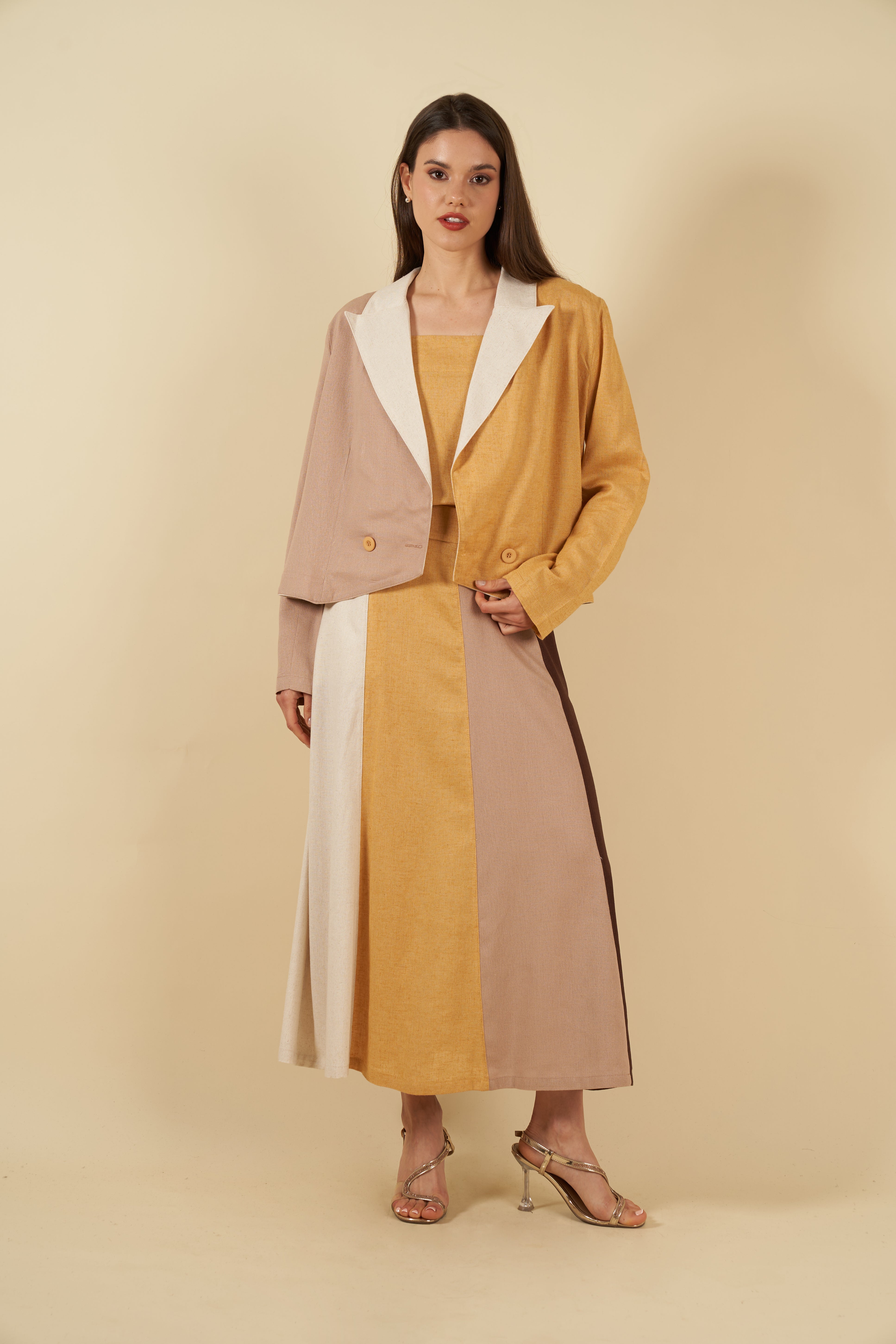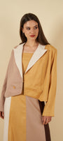 Saco ligero cruzado con dos botones y cuello en uno de los colores de la falda, aportando un toque de contraste delicado.