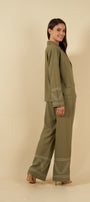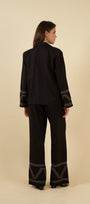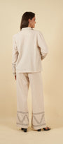 El pantalón destaca por su comodidad y calce favorecedor gracias al elástico en la espalda, que se adapta con suavidad a la figura sin perder elegancia. Sus bordados en la pretina y en la parte inferior del pantalón añaden un toque distintivo que transforma esta prenda en una pieza única, ideal para realzar conjuntos de día o de noche.