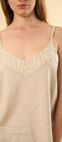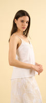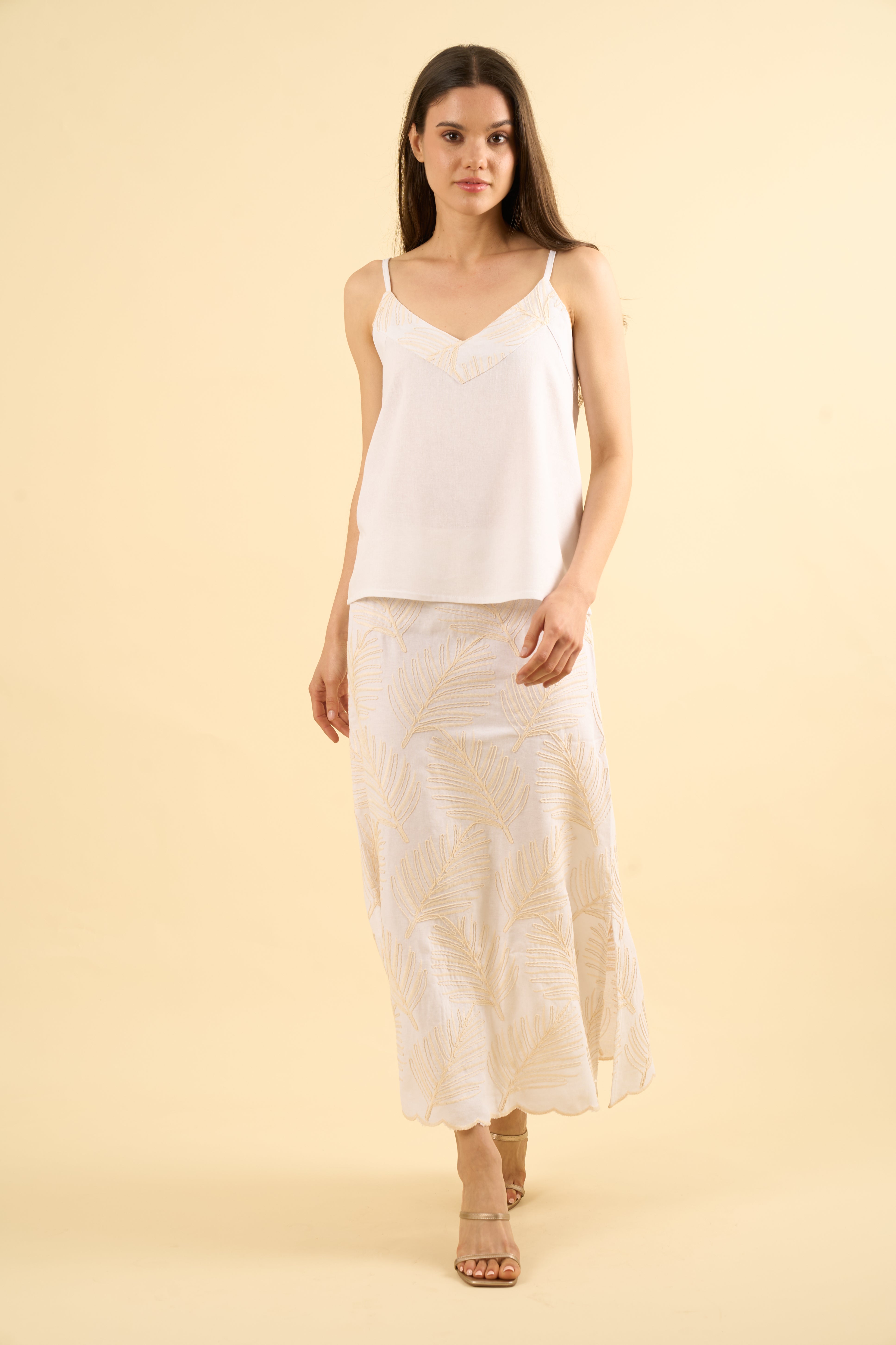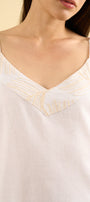 Tu top Ayla es una pieza ligera y sofisticada, confeccionada en lino con viscosa, diseñada para brindar frescura y un estilo natural. Presenta un delicado bordado artesanal en la parte superior delantera, donde hojas en tono beige se integran suavemente al escote en “V”, aportando un detalle sutil, femenino y lleno de carácter.